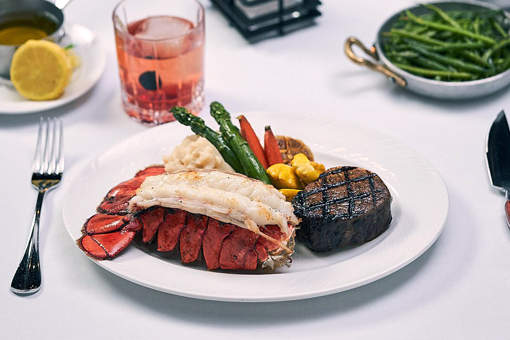 Grilled Atlantic Lobster Tail & 6 oz Filet Tenderloin – Potatoes au gratin, and fresh seasonal vegetables.