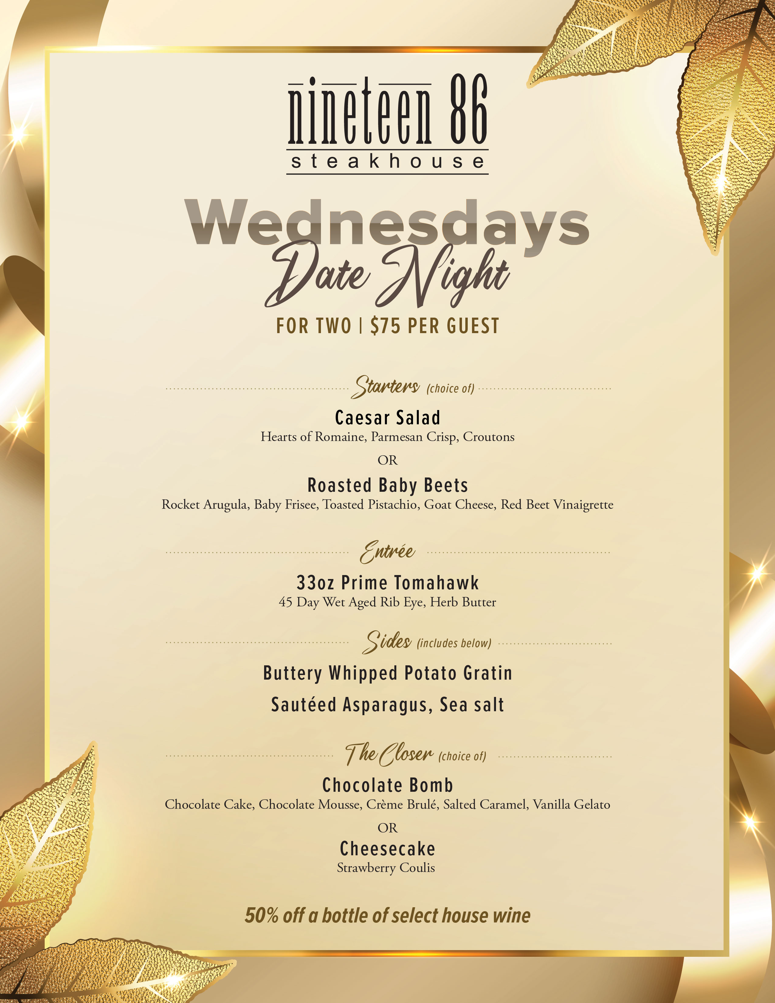 Thursday is Wine Day! Enjoy our wines half off up to $200. We have a fine selection of wines for your enjoyment.